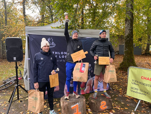Tour pédestre de Villers : Julien ; Emilie , Alain et Virginie qui monte sur le podium